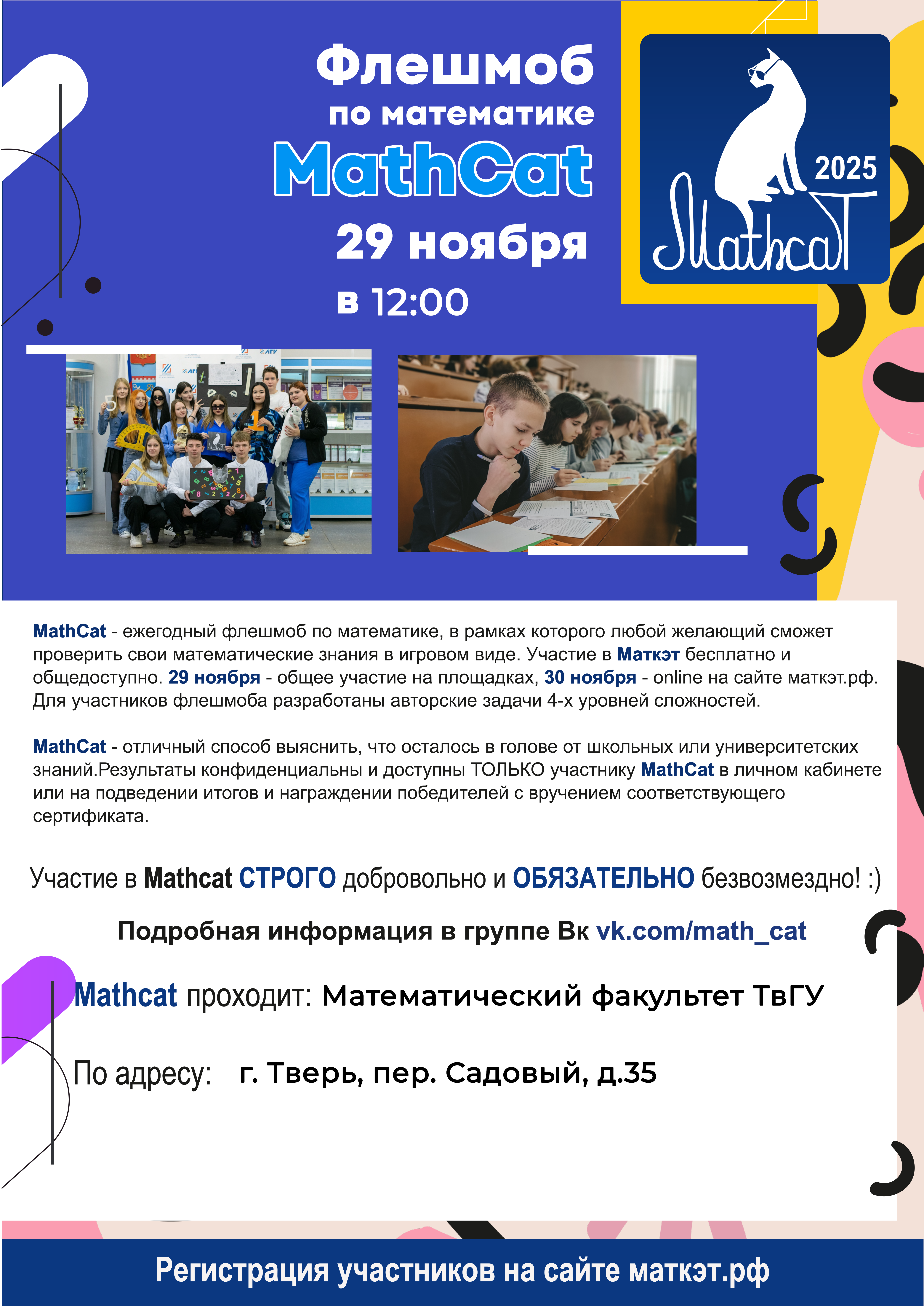 29 ноября по всей России пройдет XII ежегодный развлекательно-образовательный флешмоб по математике MathCat (Маткэт) в офлайн формате с целью популяризация математики среди школьников, студенческой молодёжи и всех желающих проверить себя в области математики и логики мышления.